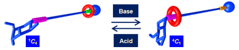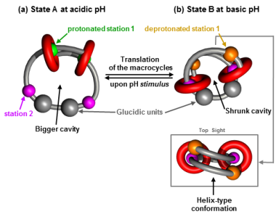 ► Des Glycorotaxanes pour le ciblage d'enzymes et de récepteurs cellulaires: la variation de l'activité enzymatique ou de son affinité pour un récepteur d'un [2]rotaxane glycosylé en fonction de la position du macrocycle est à l'étude. En particulier, nous avons démontré en 2009 la possibilité de faire varier la conformation chaise-chaise d'un motif mannopyranose en fonction d'un mouvement contrôlé de translation d'un macrocycle le long d'un axe moléculaire mannosylé. Ce mouvement de large amplitude, qui peut être généré par un stimulus extérieur de type pH, a permis pour la première fois de contrôler l'effet anomère inverse dans une molécule entrelacée