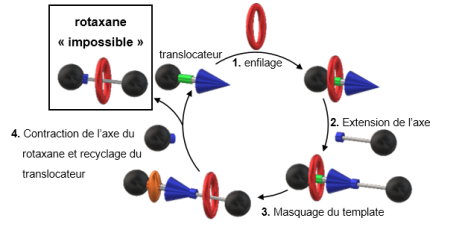 ► Accès synthétique à n'importe quel type de molécule entrelacée ! Même si les méthodes de synthèse de molécules entrelacées se sont énormément accélérées ces dernières années, elles ne permettent pas encore d'atteindre tous types de molécules. En effet, la stratégie très efficace par "effet template" qui est nécessaire à l'entrelacement des éléments à assembler a une limitation évidente majeure. En effet, elle n'est applicable qu'aux synthons supramoléculaires possédant les sites d'interactions requis pour la reconnaissance des éléments. Depuis 2014, notre équipe se focalise sur une stratégie d'accès détournée originale mêlant effet template, machinerie moléculaire et/ou distribution statistique du macrocycle le long d'un axe avant éviction du template initial. Cette stratégie très efficace fait donc appel à des espèces nommées translocateurs, capables de capter un macrocycle, de le relarguer à un axe moléculaire dépourvu de site d'interaction, et d'être générés en fin de synthèse.