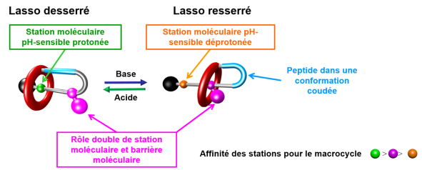 ► Accès à des molécules lassos: l'équipe SMART a décrit différentes voies d'accès à des machines moléculaires lassos, dont l'une contient un motif peptidique. A notre connaissance c'est un exemple rare ou la conformation d'un peptide (si essentielle pour son activité) est contrôlée par machinerie moléculaire via la translation d'un macrocycle le long d'un axe moléculaire.